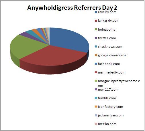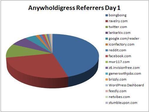 The spread of referring sites surprised me.  I plotted four days in the charts below. My excel-fu is not strong.  Apologies.